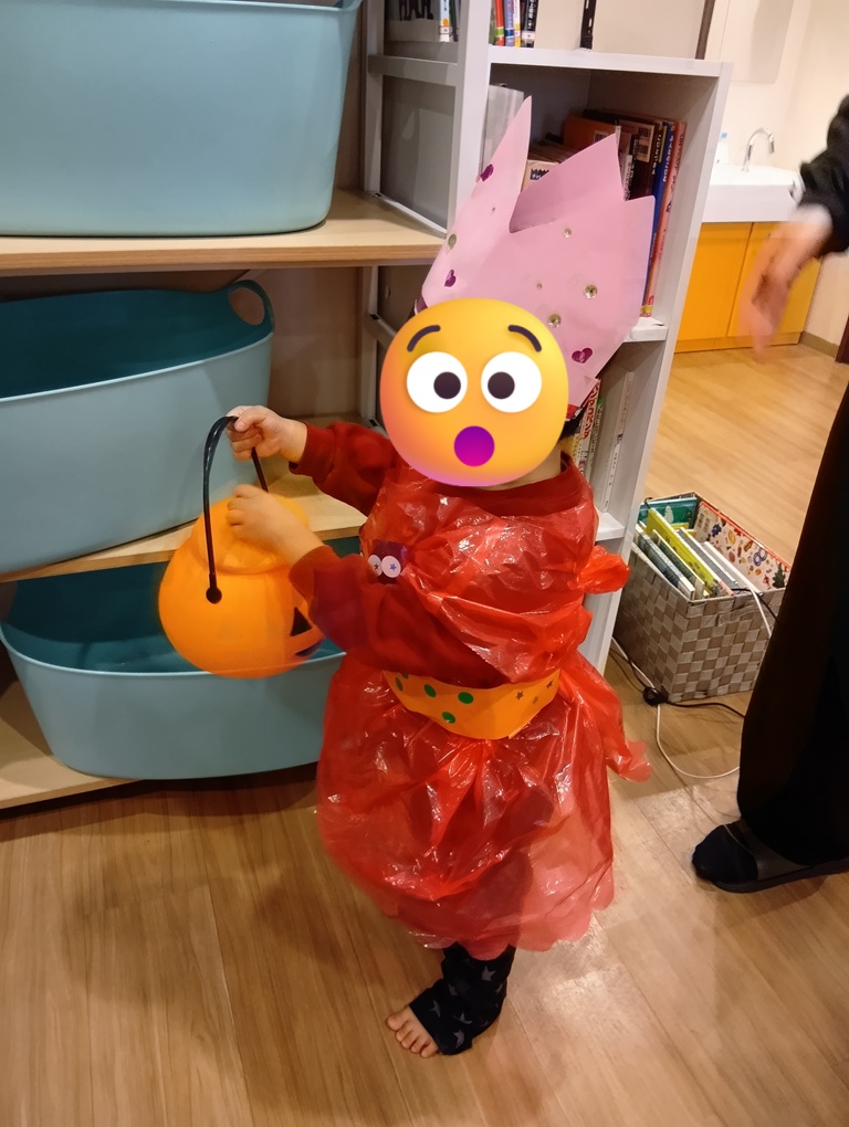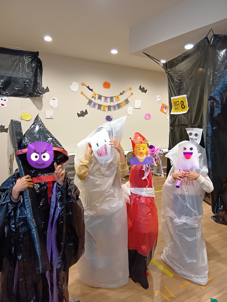 子どもたちは、約1か月間に渡り、自由時間や個別課題の時間を使ってハロウィンの仮装準備をしてきました。からかさお化けやプリンセス、ルービックキューブ等、個性豊かな仮装が出来上がりました。