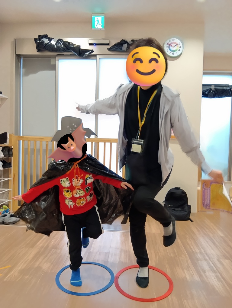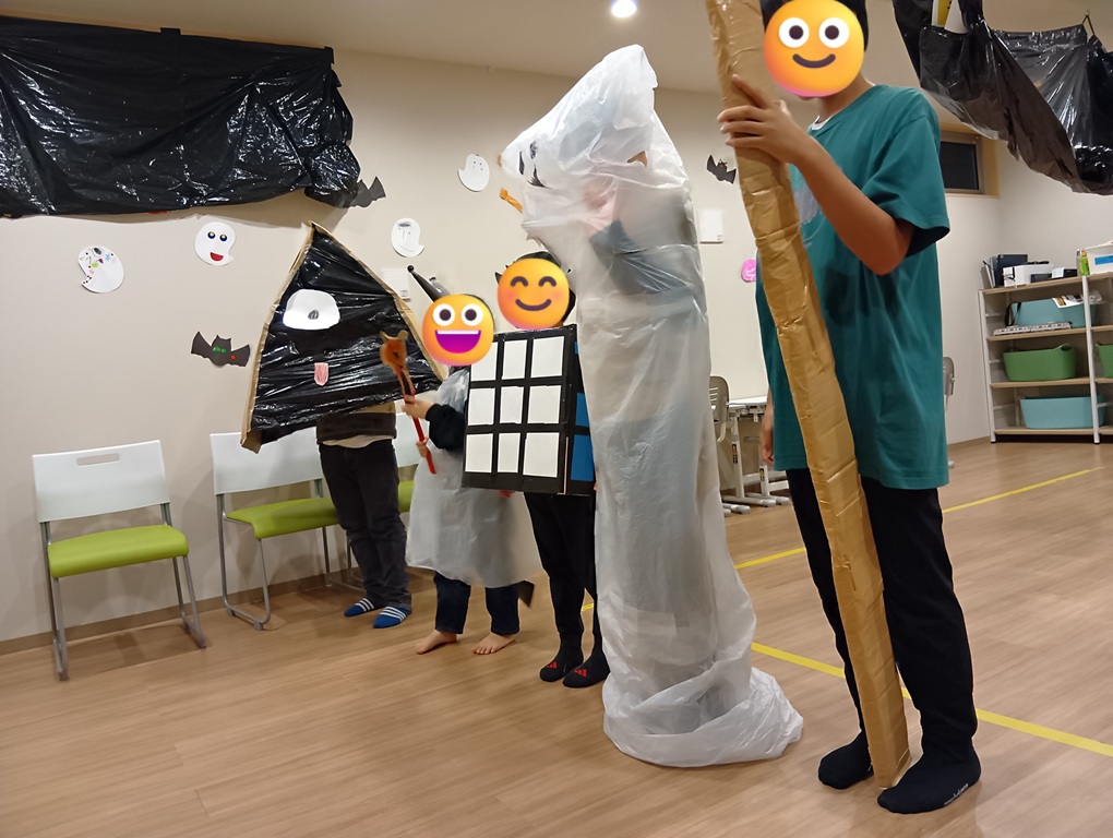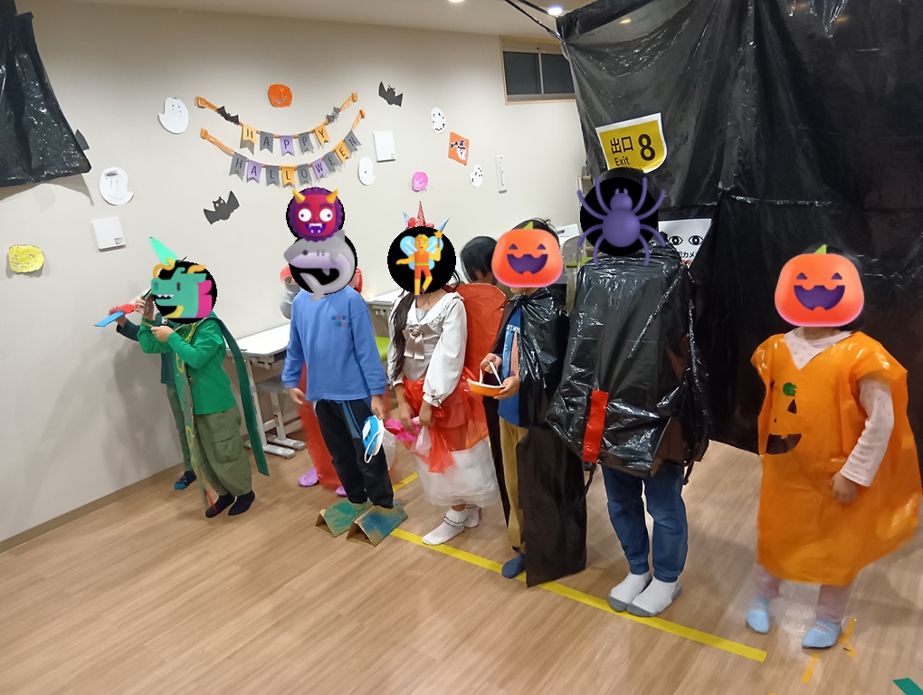 ハロウィンでは保護者の方が来る前にお化け屋敷のルールや立ち位置、飛び出すタイミングの確認をしてからリハーサルをしました。「どうやって驚かそうかな…」「なんて言って飛び出ようかな」とわくわくしながら驚かせ方を考えていました。本番では、カーテンの中でドキドキしながら出番を待ち、「きゃー!」「びっくりした!」という保護者の方の反応に大喜びの子供たち。驚かせた後はカーテンの中で「大成功だね!」と嬉しそうに指導員に笑いかけていました。