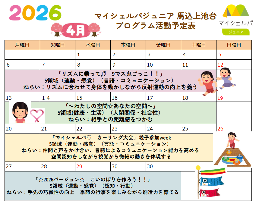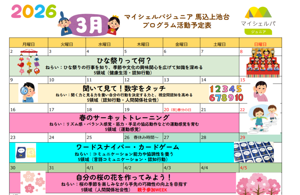 三寒四温でだんだん春に近づいてきましたね。マイシェルパジュニア馬込⁻上池台では5領域に加え季節ならではのプログラムも用意しております。