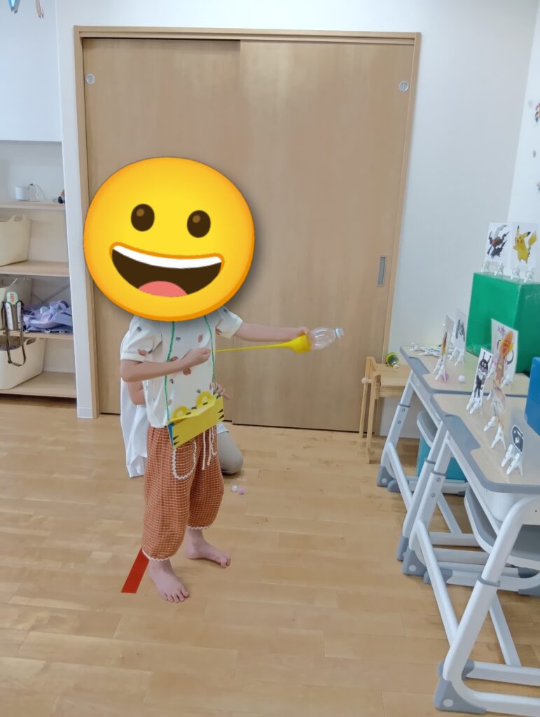 風船鉄砲で挑戦してもらいました。5発撃っていくつ倒せるかに挑戦してもらいました。狙いを定めて打つ中で、目と手を合わせる感覚や集中力が自然と養われました。