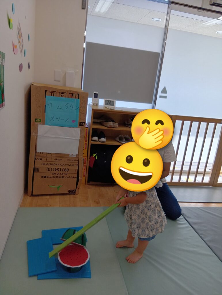 指導員や保護者の方の声を頼りに、手作りのスイカを割ってもらいました。子どもが誘導役、保護者が割る役を担当する場面もありました。見事に割れた瞬間には保護者の方とハイタッチをし、とても喜んでいました。楽しみながら空間をイメージする力を働かせたり、人の声に耳を傾ける経験になったりと、お友達や家族と達成感を分かち合う時間になりました。