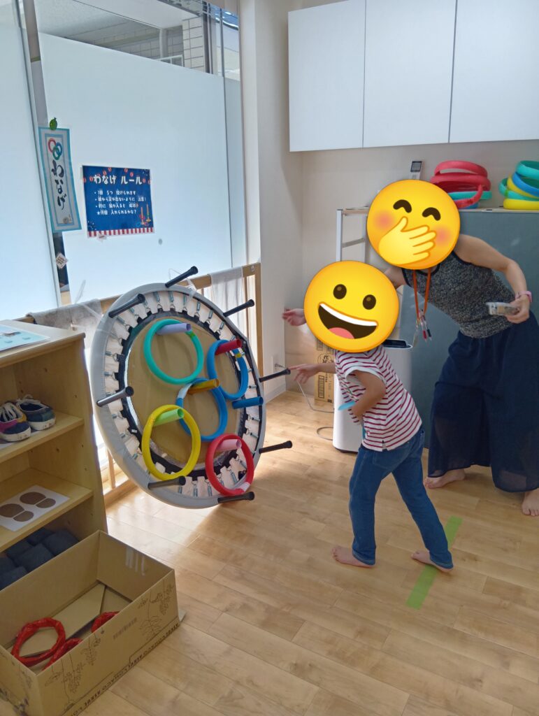 5つの輪っかを投げ、何個入るか挑戦してもらいました。力加減や投げる角度を工夫しながら取り組むうちに、少しずつ成功する姿が増え、5つすべて入れられる子もいました。
