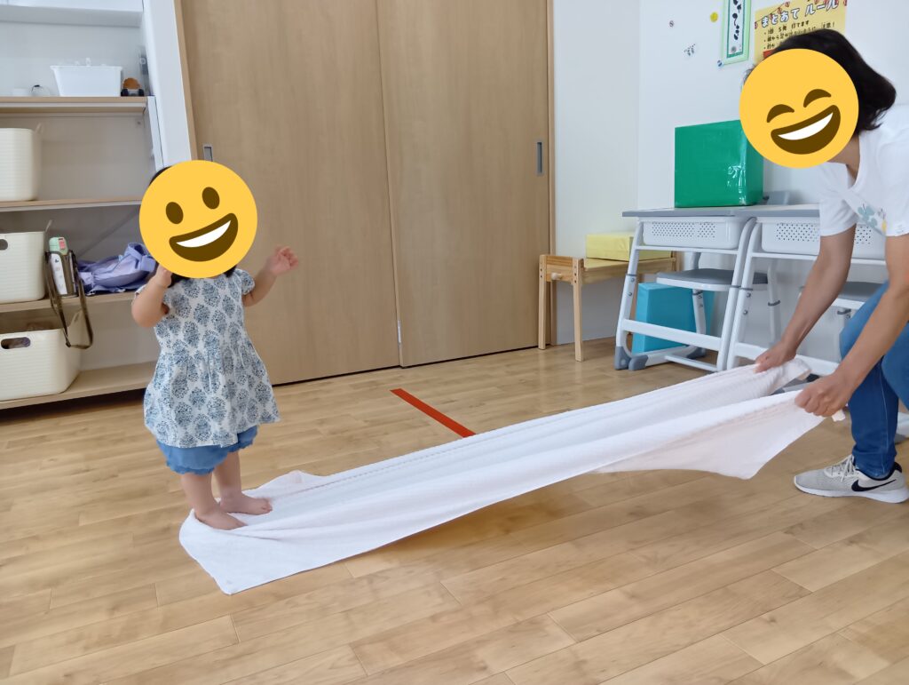 大人がタオルの端を持ち