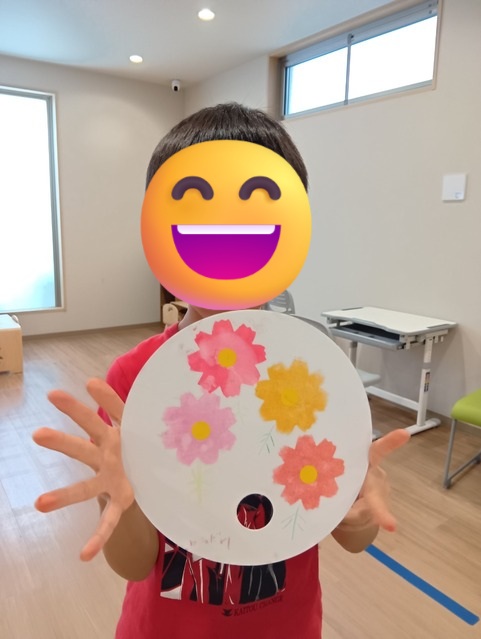 まず最初に誰に渡すか、メッセージは何か、どのデザインにするか等計画表を書いてもらいました。デザインはブドウ・コスモス・自由の3種類から選んでもらいました。「おばあちゃんブドウ好きだから」「秋っぽいものをいっぱい書きたいから自由にする」等、それぞれ渡す相手のことを想って計画を立てていました。ブドウやコスモスは型紙とスタンプを使って作りました。保護者の方に型紙を抑えてもらったり、「どこにお花のスタンプをしようか?」とデザインを相談したりと、コミュニケーションをとりながら制作を進めていました。感謝を形にする体験を通して、季節や人とのつながりを感じる時間になりました。今後もこうした学びを大切にしていきます。