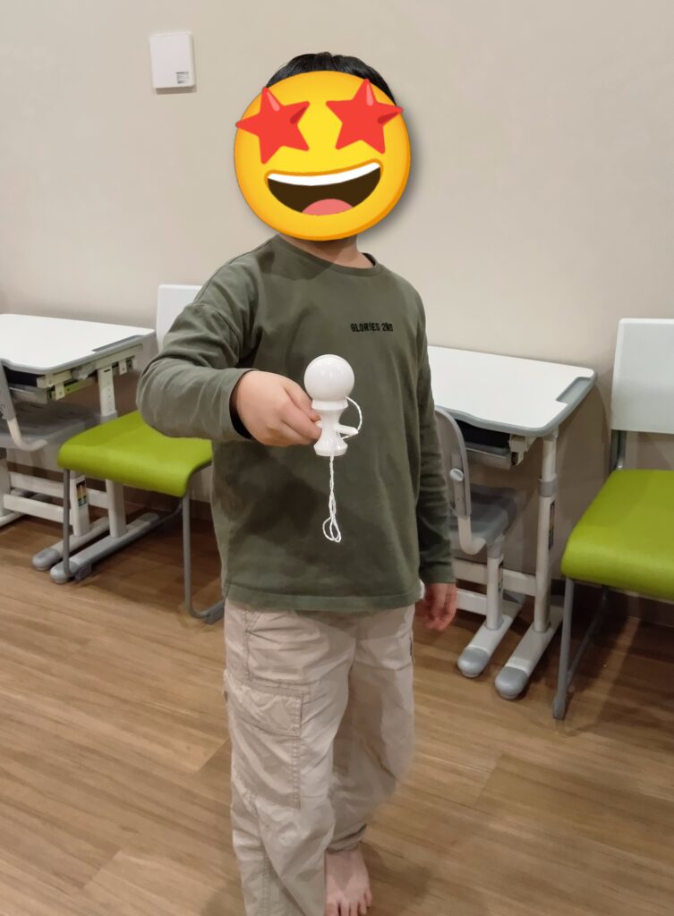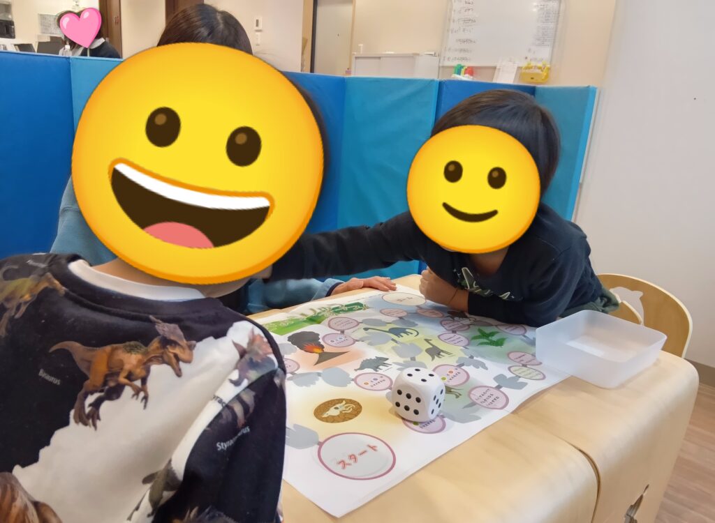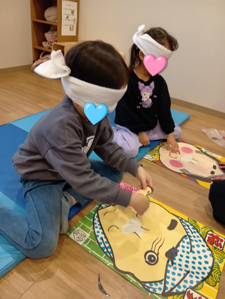 すごろくでは、少人数のグループに分かれ、順番を意識しながらサイコロを振りゴールまでの道を楽しく競い合いました。福笑いでは、目隠しをしておかめやひょっとこの顔に挑戦 ! 慎重に目・鼻パーツを配置し、完成した顔を見て大笑いする場面もありました。こまやけん玉、羽根つきでは、最初は苦戦しながらも、くり返し挑戦して楽しむことができました。