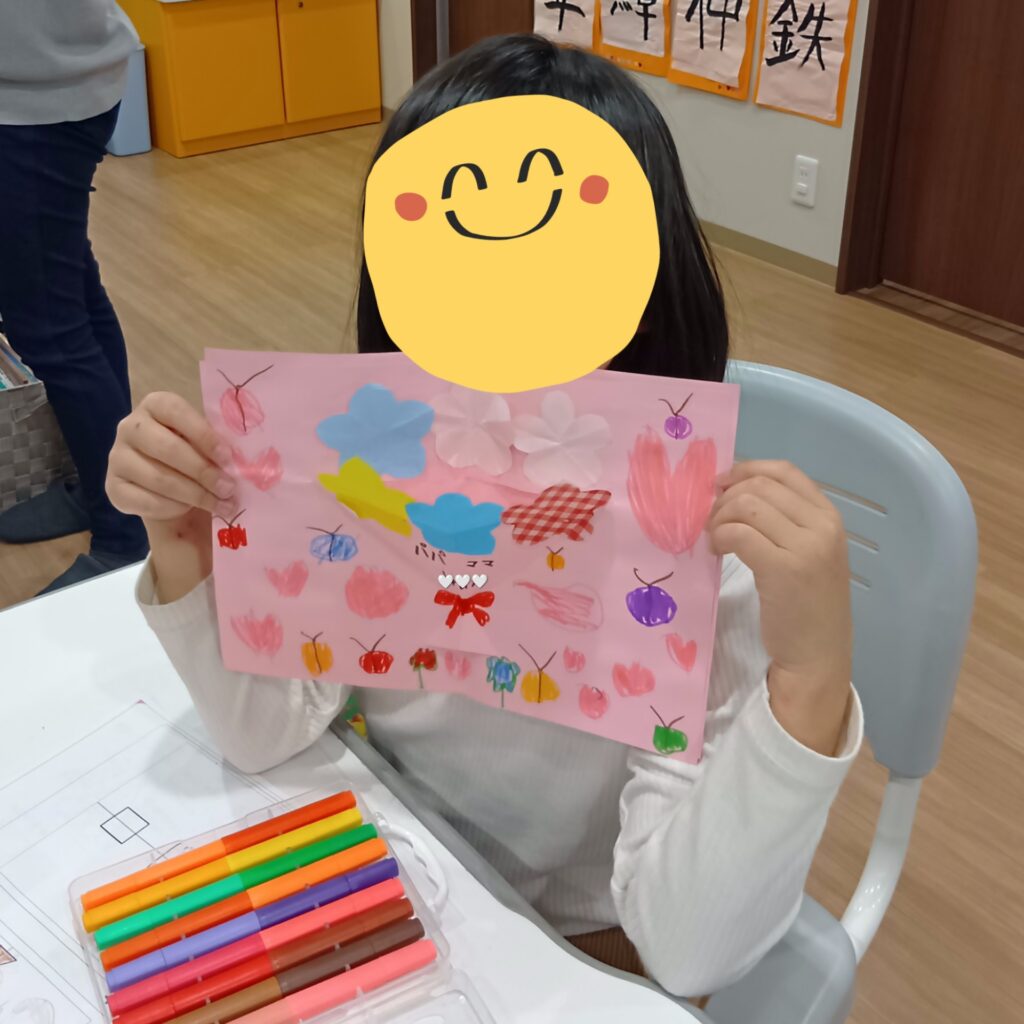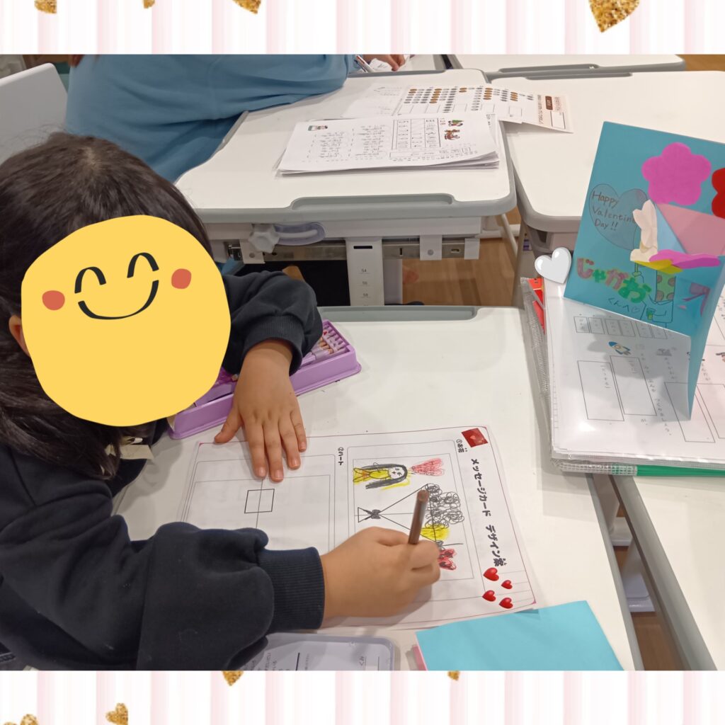 今回のプログラムは、バレンタインに向けて飛び出すポップアップカード作りに挑戦しました。事前にカードの計画書を作り、誰にあげたいか、どんなメッセージにするか、デザインはどうするかを考えました。「ママにあげる!」「お父さんにあげたい!」「お友達にあげたい!」などプレゼントする相手を思いながら、色画用紙の台紙にお花やハート、チョコレートなどの飾りを付けました。折り図を見ながら5枚の花びらのお花作りに挑戦したり、カラーペンで「だいすき♡」などのメッセージを書いたり、個性あふれる素敵なカードが完成しました!