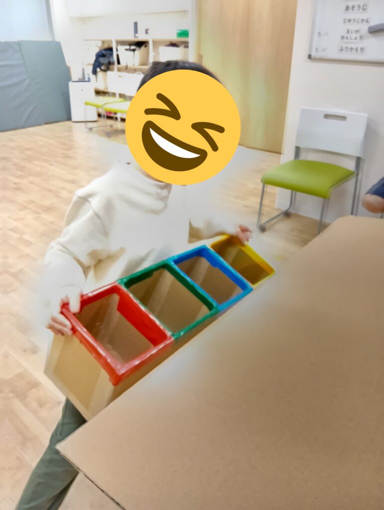 転がってくるボールと同じ色の箱に瞬時に入れるという目と手の協応運動を行いました。