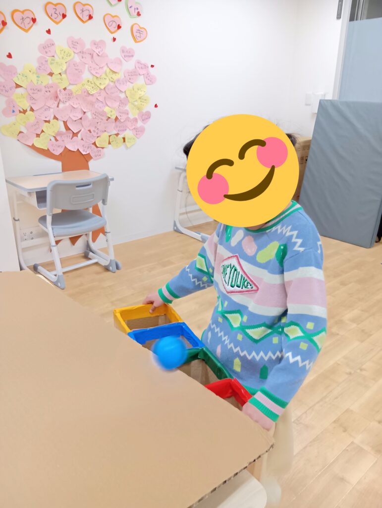 傾斜のボードから4色のボールが流れてくるのをしっかりと見つめて、ボールをキャッチする色分けされた箱にボールを入れる!!他の色のところにボールが入ってしまったり、うまくキャッチできずに落としてしまったり簡単そうで難しい・・・