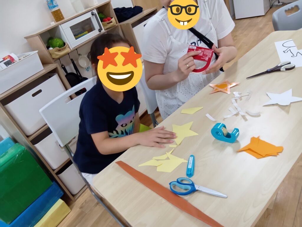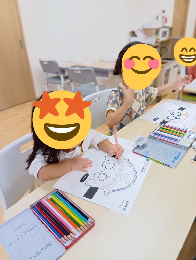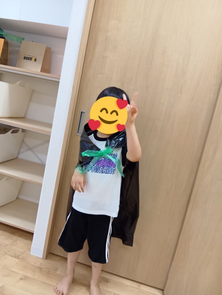 自分で計画が難しいお友達は、何種類か用意した仮面の中から選び、色塗りをしたり、マントにシール貼りをしました!